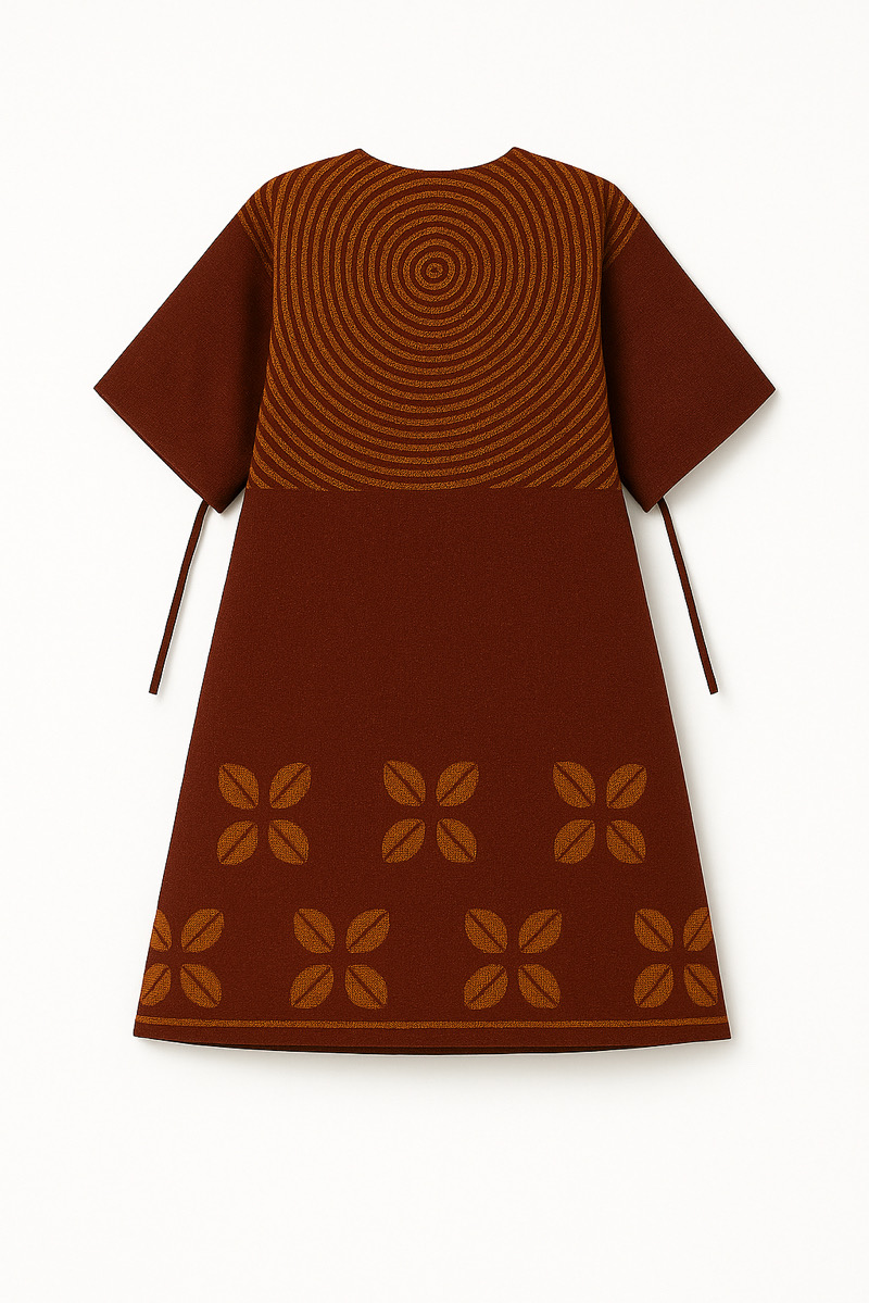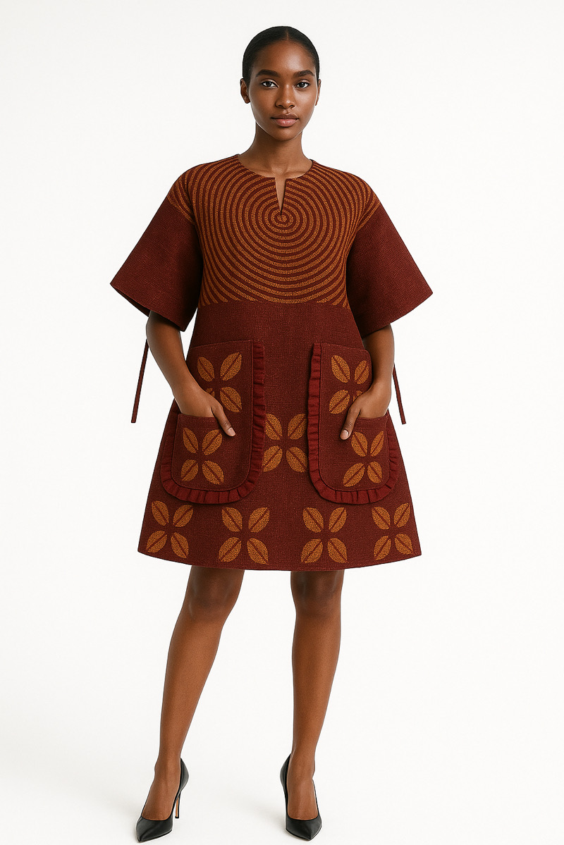 The Adire Tunic Dress is a stylish and structured short dress featuring a rich terracotta base. It boasts a unique circular pattern on the bodice and complementary leaf motifs on the two large front pockets, accented with ruffled edges. The dress has a notched neckline and elbow-length sleeves with tie details. Pair with – Pointed-toe heels or stylish ankle boots for a sophisticated look. Wear to – Semi-formal events, art exhibitions, or smart casual gatherings.