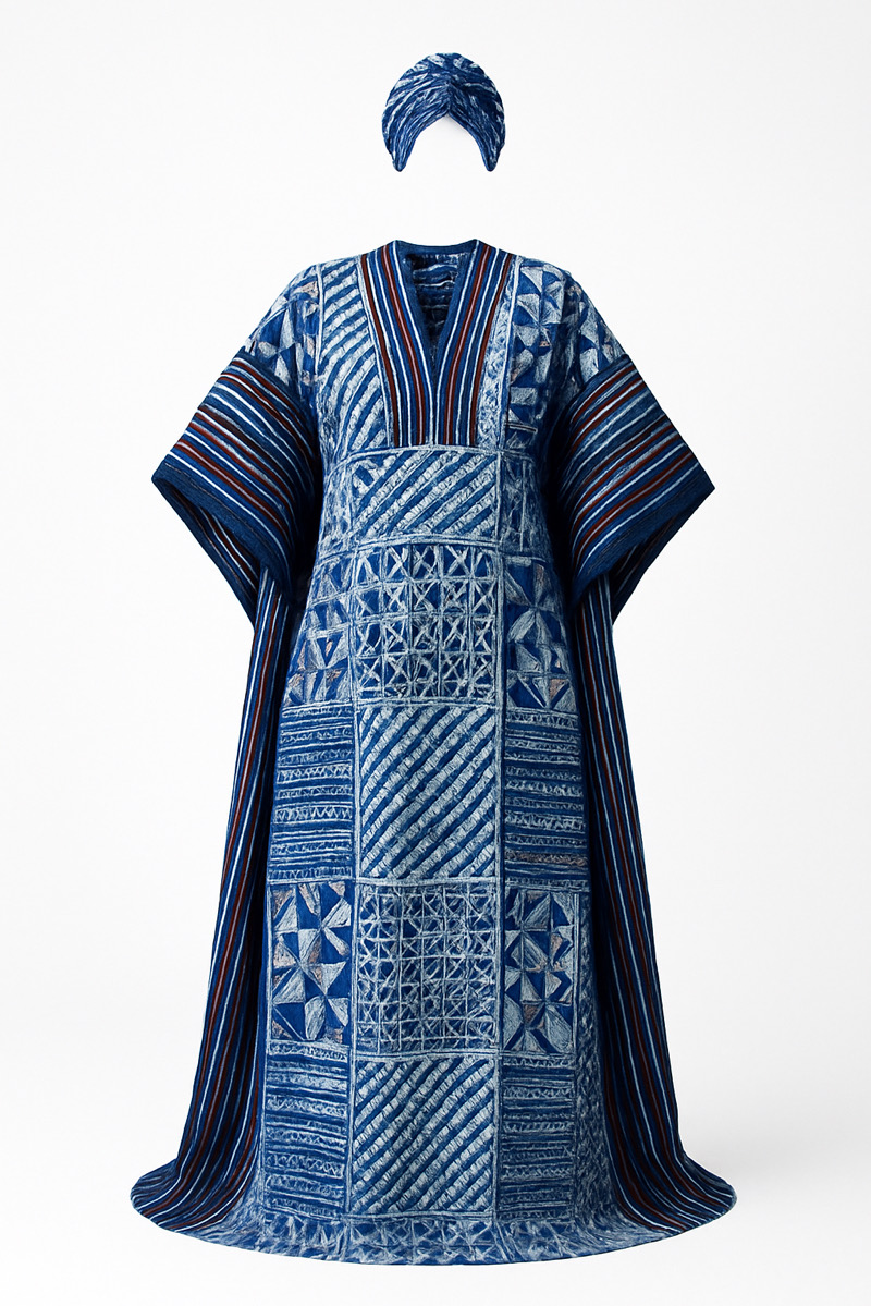 The Adunni Indigo Kaftan is a majestic, flowing maxi dress in varying shades of blue and white, featuring intricate geometric patterns. The kaftan has a comfortable V-neckline and wide, draped sleeves with striped borders in red, blue, and grey, adding a striking contrast. It comes with a matching headwrap. Pair with – Flat sandals or elegant heels, and minimal jewelry to let the intricate design stand out. Wear to – Special occasions, cultural events, or elegant gatherings.