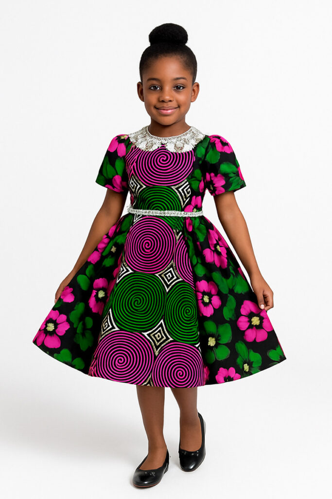 Bespoke children’s dress crafted from rich Ankara fabric with intricate patterns, designed exclusively by Wankara Africa. Each piece is handmade with attention to detail, featuring luxurious African prints blended with lace accents. Perfect for birthdays, weddings, or cultural celebrations.