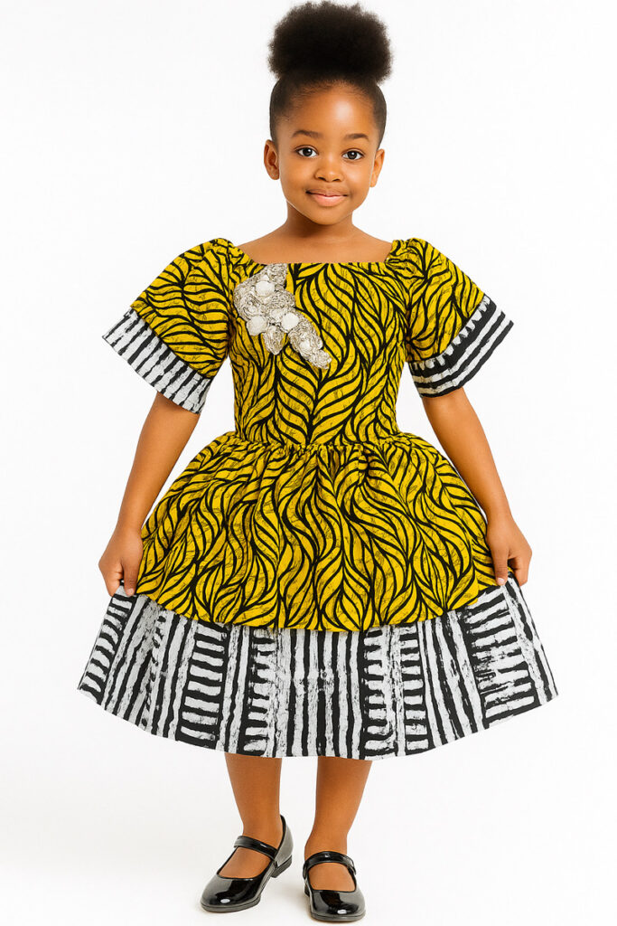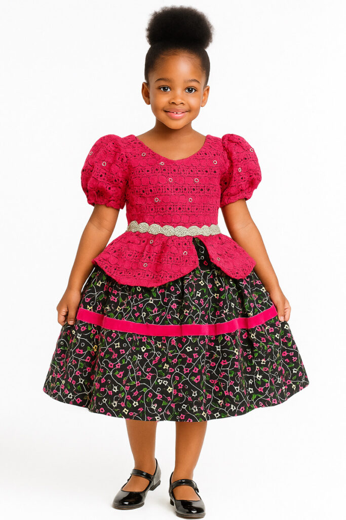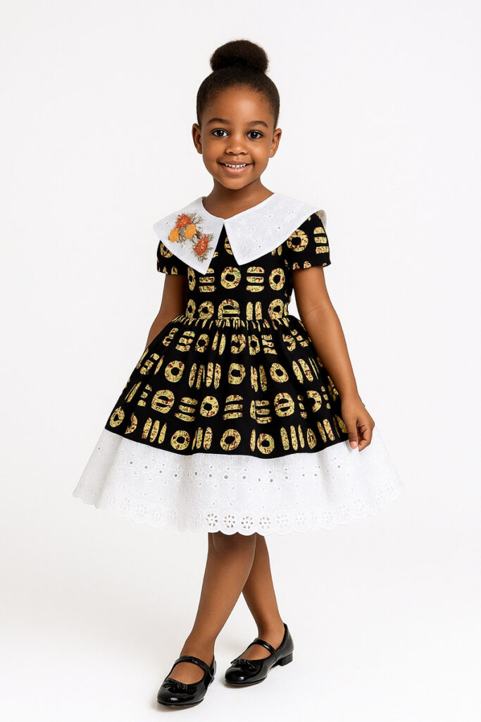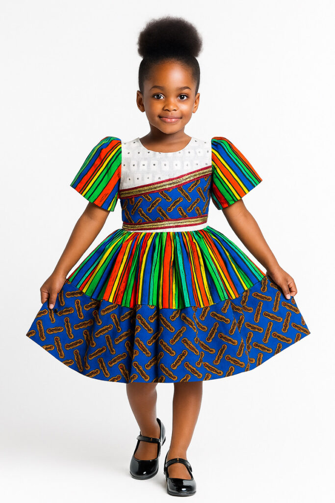 Bespoke children’s dress crafted from rich Ankara fabric with intricate patterns, designed exclusively by Wankara Africa. Each piece is handmade with attention to detail, featuring luxurious African prints blended with lace accents. Perfect for birthdays, weddings, or cultural celebrations.