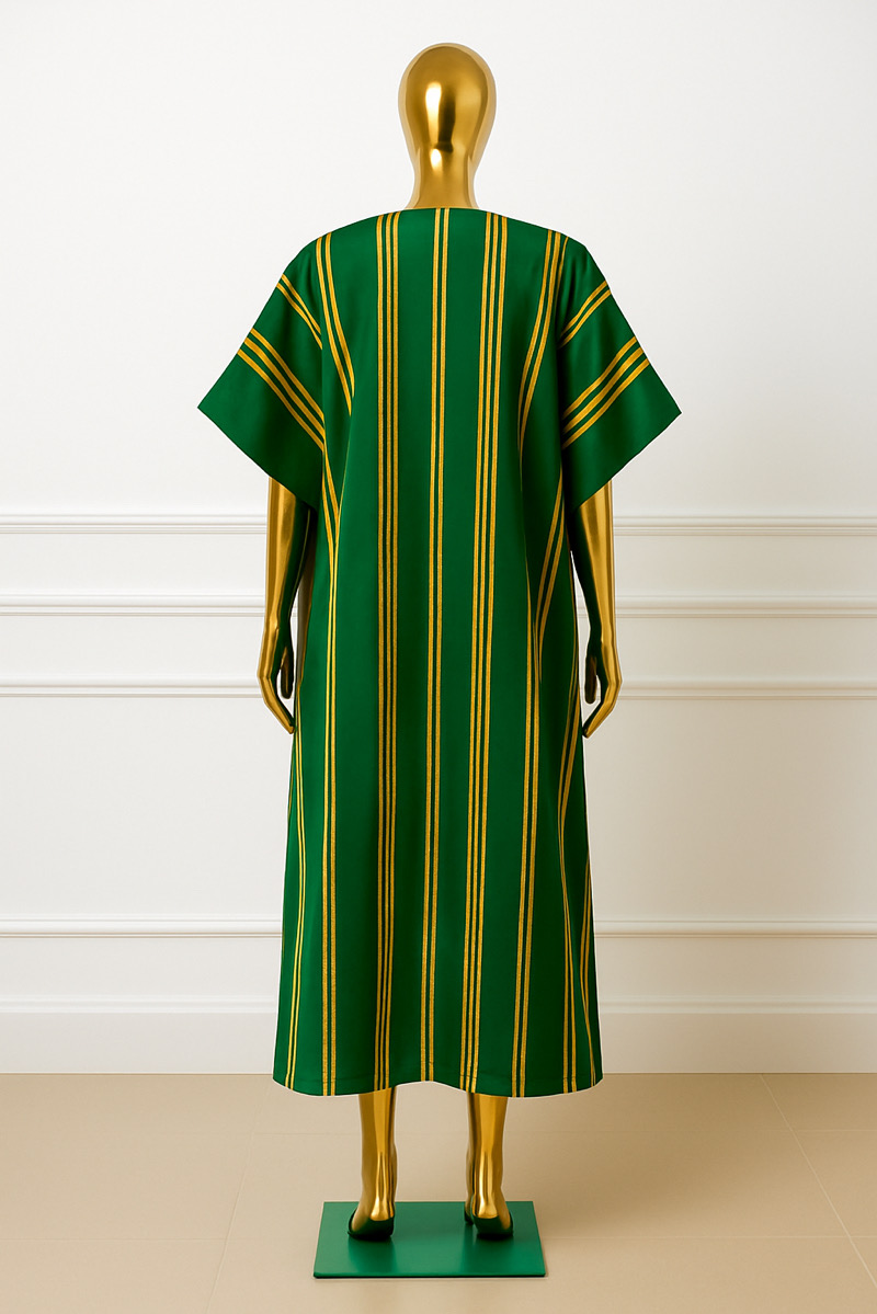 The Ayọ̀déle Striped Kimono is a striking, open-front jacket in a vibrant green hue. It features bold vertical stripes in yellow, black, and subtle pink, along with wide, relaxed sleeves and functional front pockets with matching stripe details. The kimono has a comfortable, flowing silhouette. Pair with – All-black attire to allow the kimono to stand out, such as a black top and tailored trousers. Complete the look with pointed heels and statement earrings.