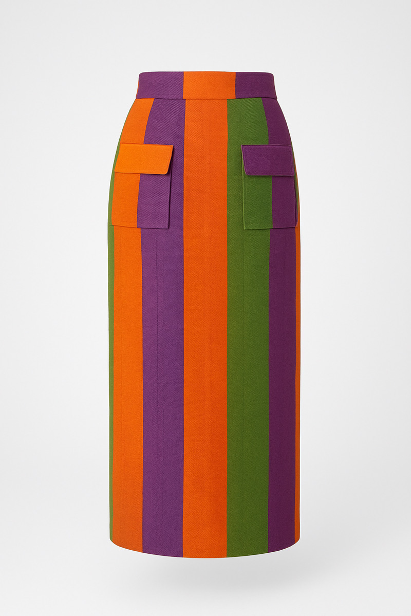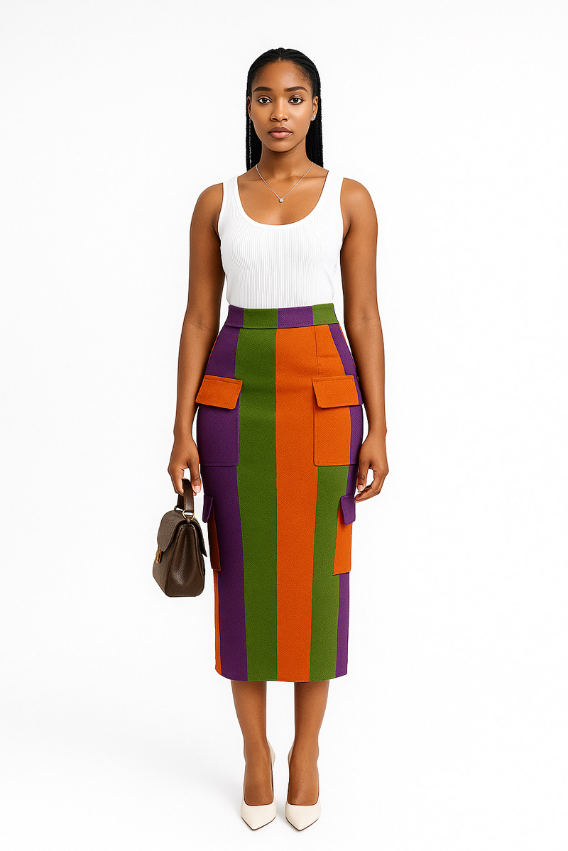 The Dara Striped Cargo Skirt is a stylish knee-length skirt featuring bold vertical stripes in orange, purple, and green. It is designed with functional, rectangular cargo pockets on the front, adding a utilitarian yet chic touch. The skirt has a fitted silhouette and a high waist. Pair with – A simple white tank top or a fitted blouse, and pointed-toe heels. A structured handbag complements the look. Wear to – Casual outings, smart-casual events, or creative work environments.