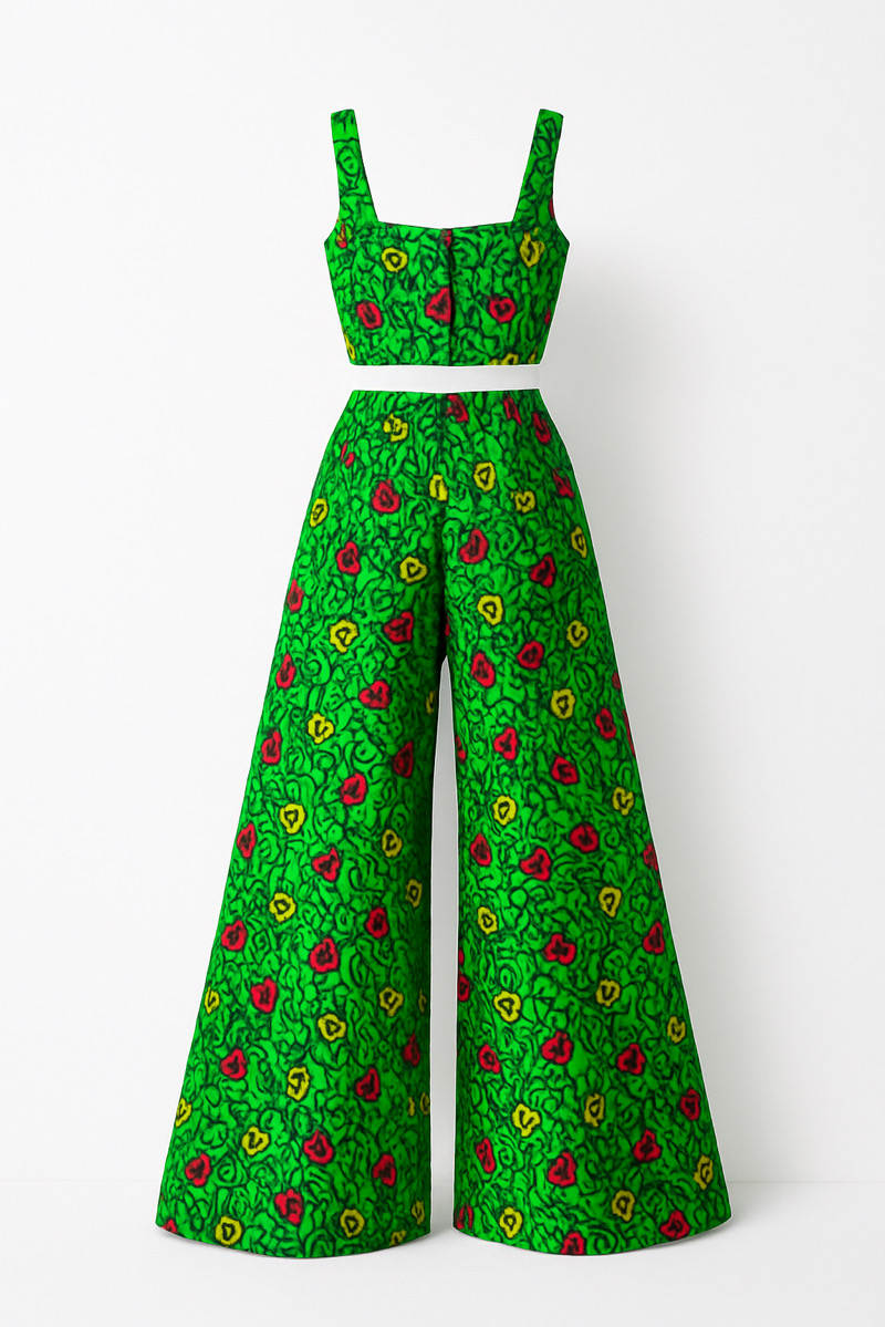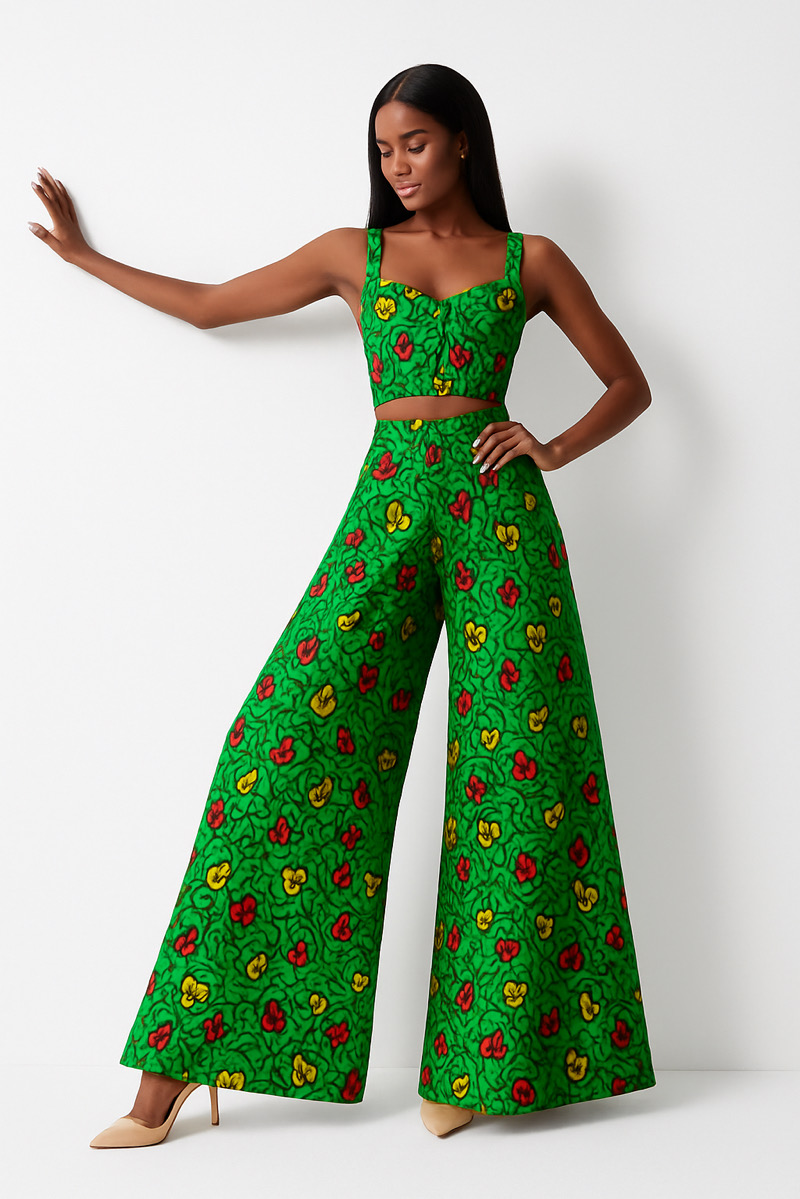 The Ifiok Floral Co-ord Set is a vibrant two-piece ensemble featuring a cropped top with a sweetheart neckline and thick straps, paired with high-waisted, wide-leg palazzo pants. Both pieces are adorned with a playful all-over floral pattern in red and yellow on a bright green background. The top has button detailing down the front, and the pants offer a relaxed, flowing silhouette. Pair with – Nude heels or flat sandals for a casual or dressed-up look. Minimal jewelry will allow the bold print to shine. Wear to – Summer parties, resort wear, or festive gatherings.