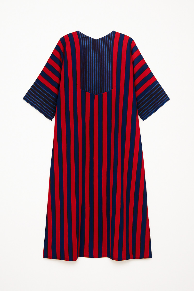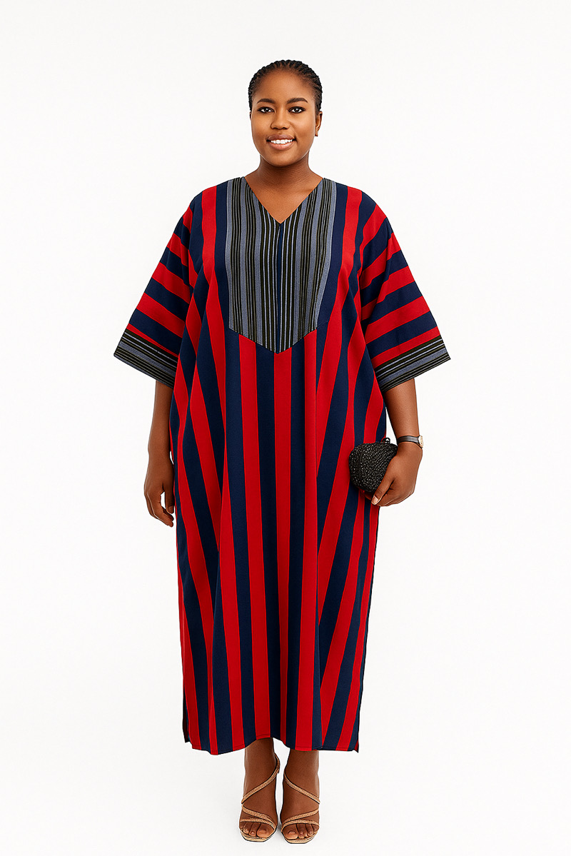 The Kìíní Striped Kaftan is a chic and comfortable flowing maxi dress. It features bold vertical stripes in alternating red and navy blue, with a striking grey striped V-neck panel. The kaftan has wide, relaxed sleeves and a relaxed fit.