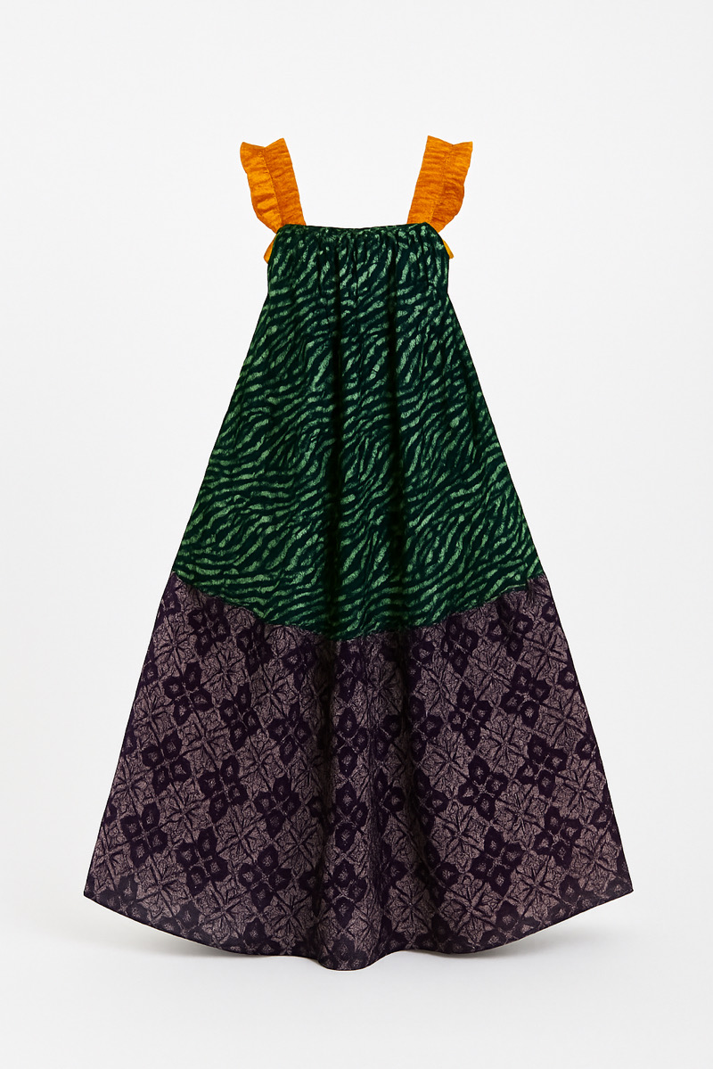 The Morenike Maxi Dress is a flowing, tiered dress with a relaxed silhouette. The top tier features a deep green fabric with a wavy, textured pattern, while the bottom tier showcases a dark purple fabric with a beige geometric print. The dress has an orange trim along the V-neckline and ruffled shoulder straps.