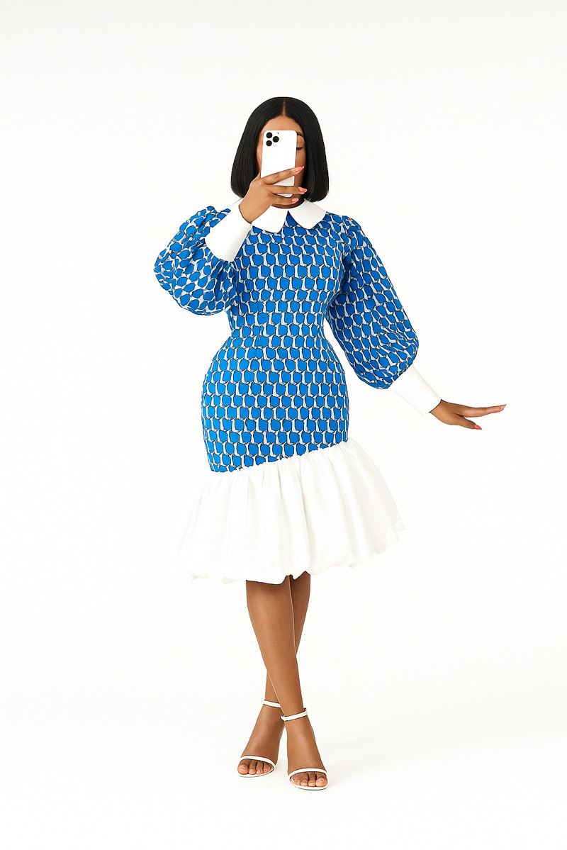 This vibrant dress showcases a unique blend of modern design and traditional patterns. The fitted bodice and voluminous puff sleeves, adorned with a bold blue and white Adire-inspired print, lead to crisp white cuffs and a classic Peter Pan collar. The playful silhouette is completed by a dramatically full, white bubble-hemmed skirt. This piece elegantly merges contemporary style with the rich artistic heritage of African tie-dye techniques.